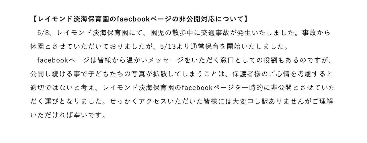 同園は日々の様子をFacebookにて公表していました。しかし、事故後は非公開としました。