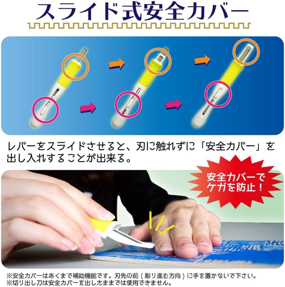 私の子供時代と比べると、最近の彫刻刀は安全対策が進化していますね。スライド式の安全カバーや滑りにくいグリップが備えられていました。