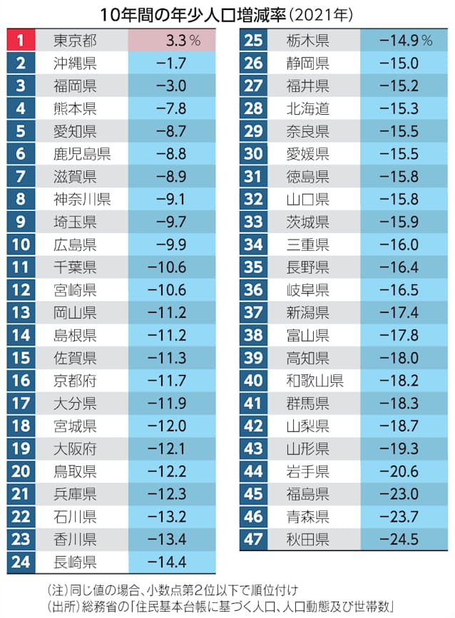 溜息をついたのは、10年間の年少人口増減率(都道府県別)です。10年間で年少人口が増えたのは東京都のみ、沖縄県と福岡県が微減、それ以外は概ね10%~20%ほど減少していました。