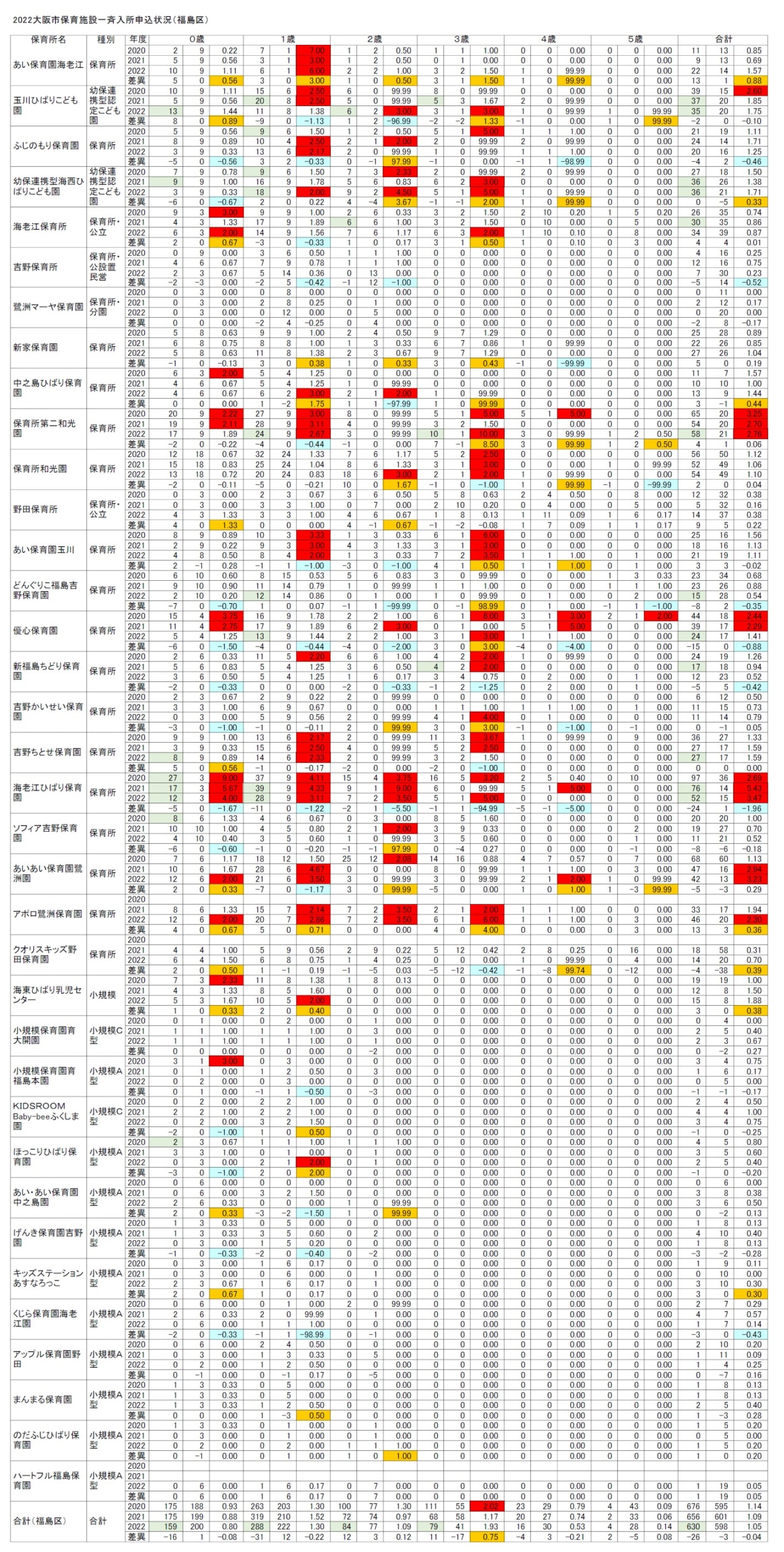 「吉野」という名が付く保育所が多いですね。同じ福島区と言えども、未就学児が急増している地域と減少している地域に二分化されている様子です。