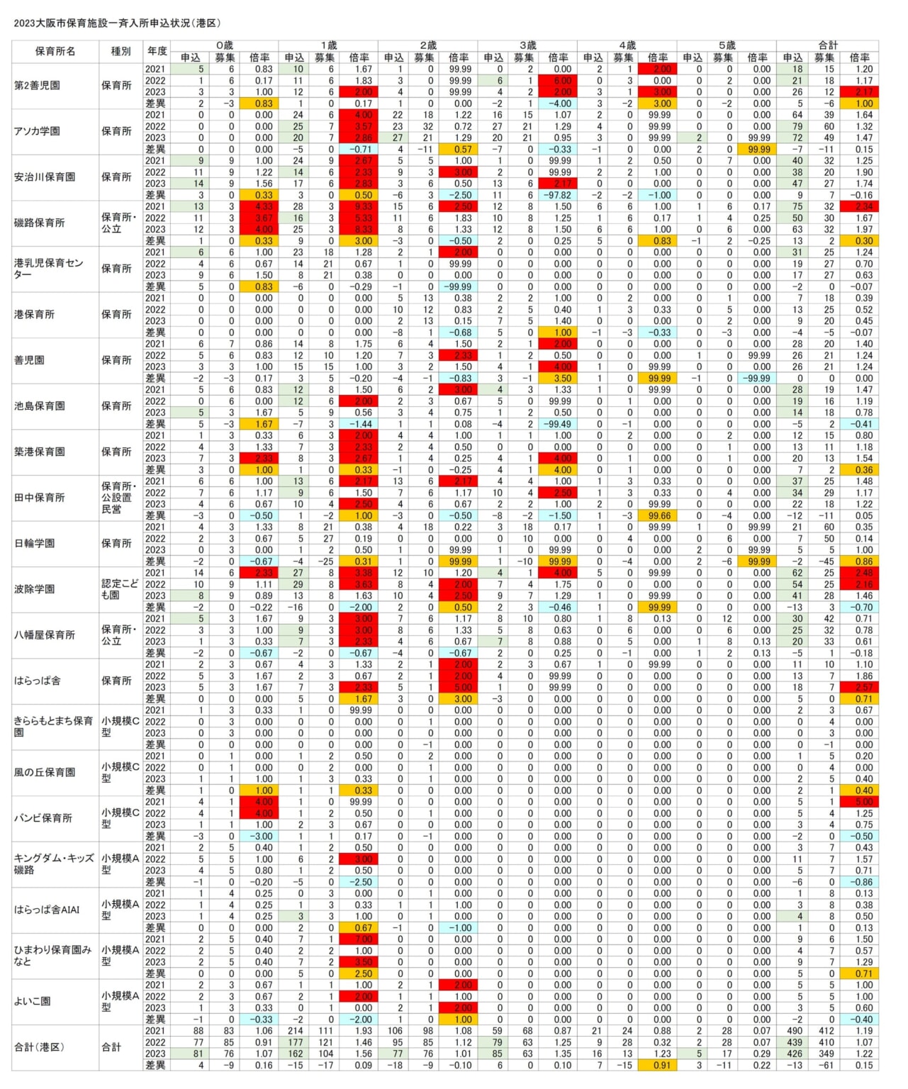1歳児倍率は他保育所等でも著しく高くなっています。アソカ学園・安治川保育園・築港保育園・田中保育所・ひまわり保育園みなとは3倍前後に達しています。フルタイム共働きでも入所できない可能性が強いです。