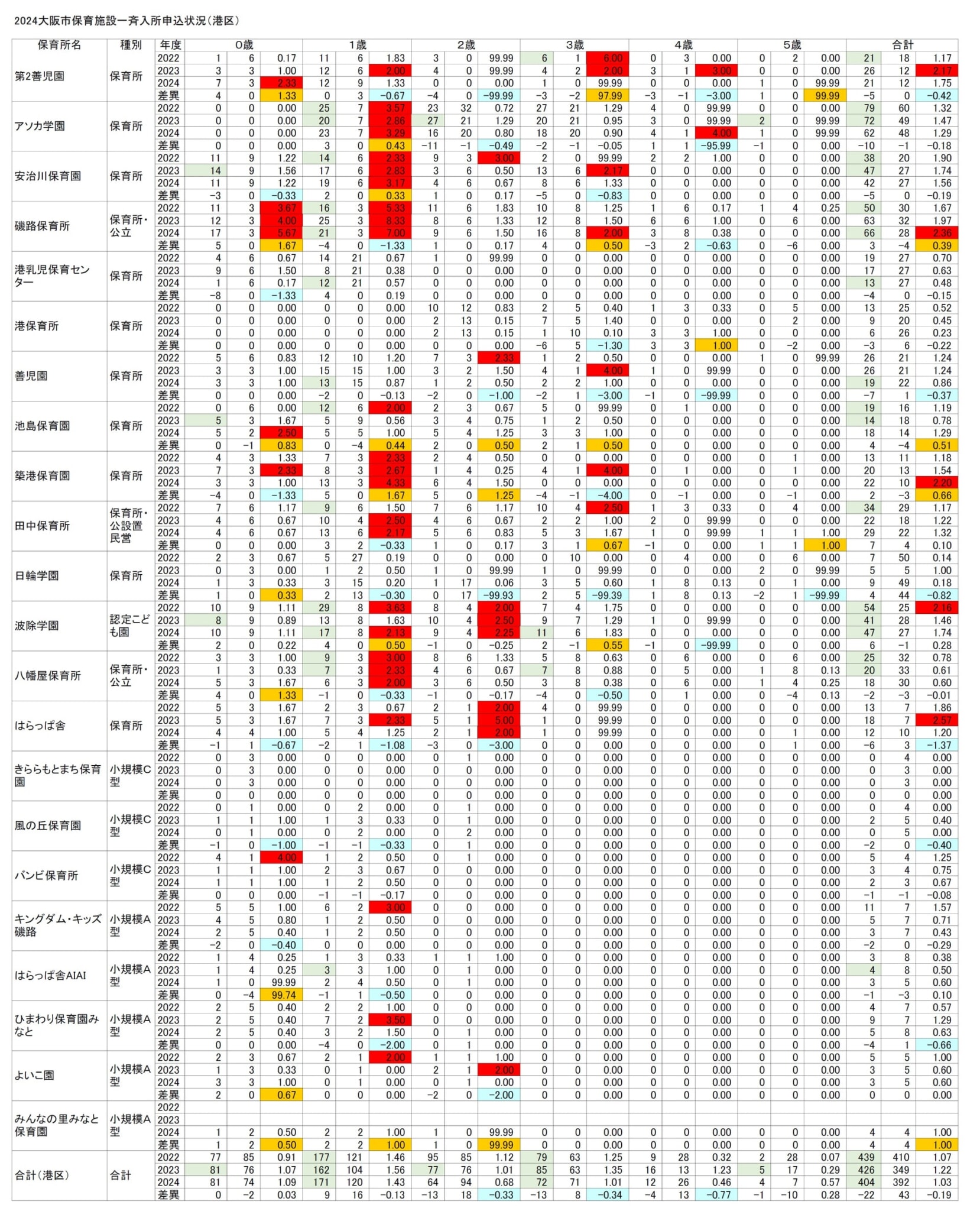 1歳児入所倍率が2倍を超えたのはアソカ学園(3.29倍)・安治川保育園(3.17倍)・磯路保育所(7倍)・築港保育園(4.33倍)です。何らかの加点が無ければ、入所するのは困難だと考えられます。