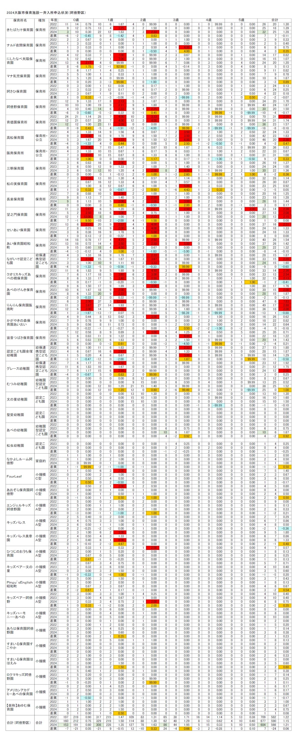 0歳児入所倍率が2倍を越えたのは、にしたなべ太陽保育園(募集数半減かつ第1希望倍増、おかしな動きです)・阪南保育所・望之門保育園(12倍)・りんりん保育園阪南町です。望之門保育園の入所倍率は異常な値であり、周辺他園に第1希望を変更する方が少なくないと考えられます。