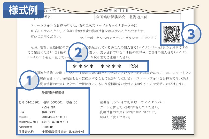 「資格情報のお知らせ」は保険者(健保組合等)から届けられます。保険者名称・保険番号・氏名等が印字されています。記載内容は従来の健康保険証と同一です。下記様式集に「1」と記載されている左下部分です。