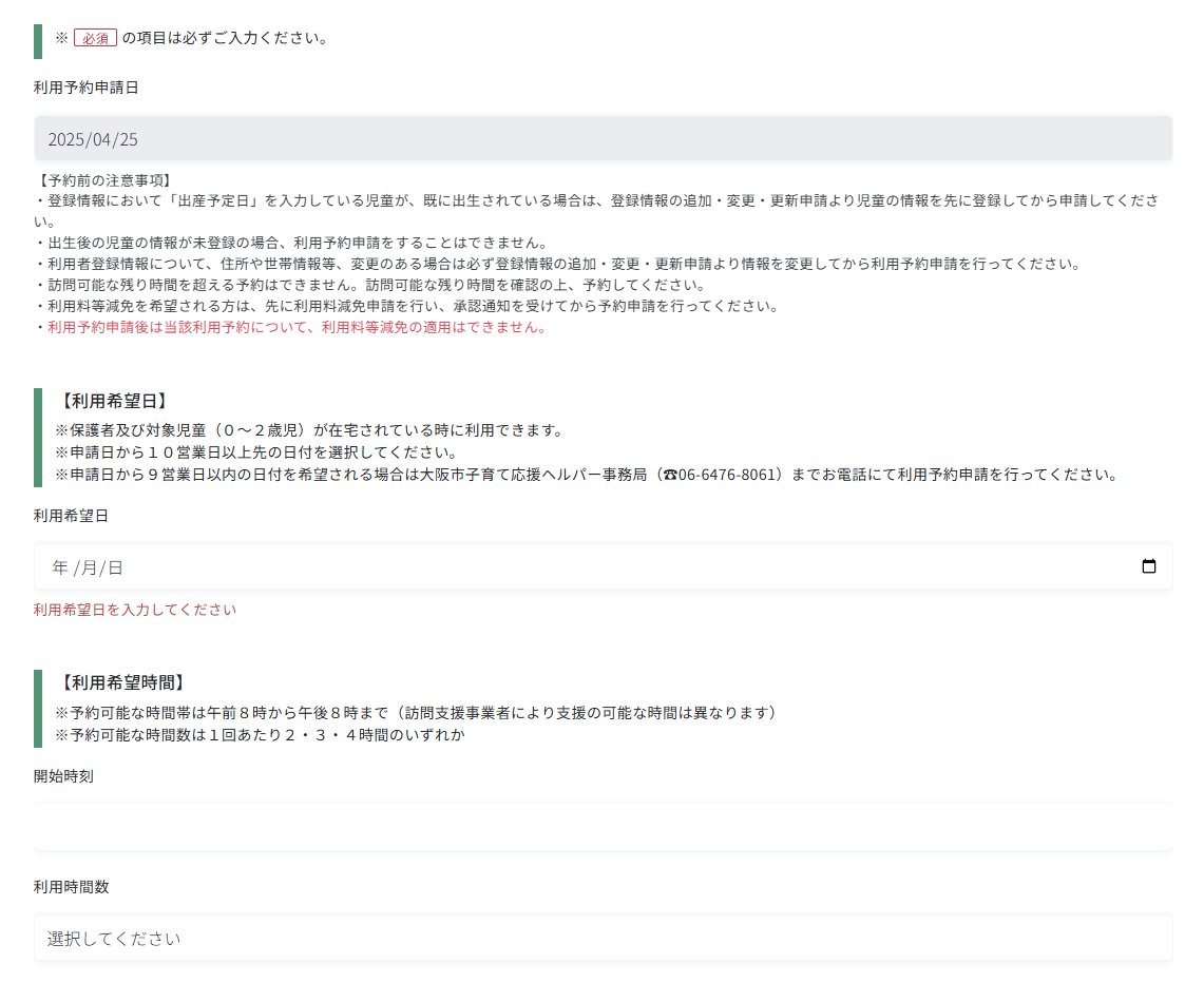 「明日に来て欲しい」といった利用はできません。利用出来るのは原則として申請日から10営業日以降となります。つまり10日後以降です(0日以内の利用は事務局へ電話で依頼する)。