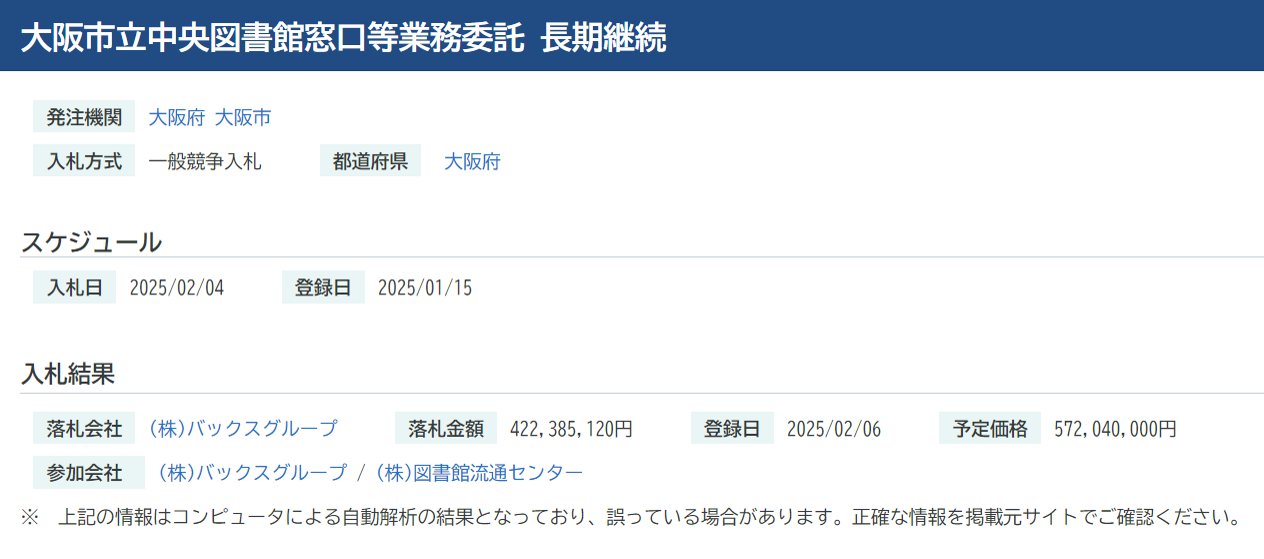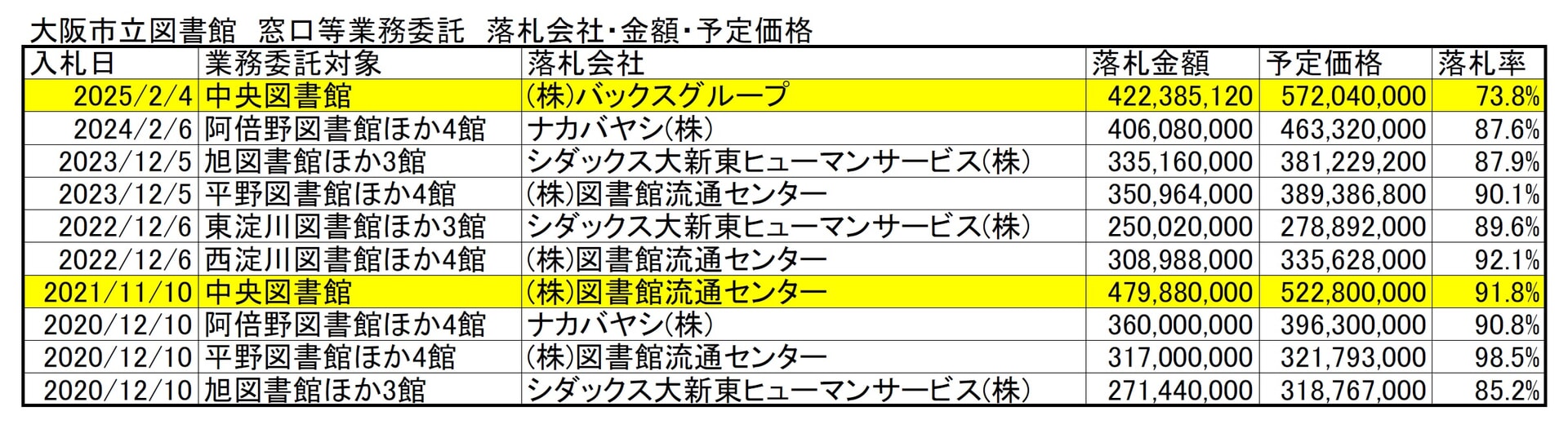 大阪市は図書館に関する様々な業務を外部に委託しています。エヌ・サーチよりここ5年間ほどの図書館窓口等業務委託に関する入札・落札情報を抽出しました。