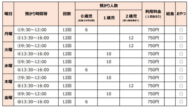 利用対象者は生後半年~満3歳未満の子供(但し認定こども園、保育所、地域型保育事業、企業主導型保育事業を利用している子供を除く。)、利用可能時間は子供1人あたり1か月10時間まで、利用料は1時間300円です(食事代等は別途必要)。