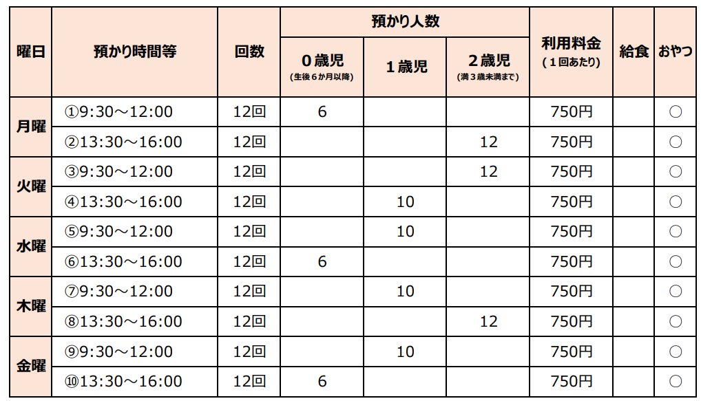 時間帯は午前もしくは午後の2時間半、給食の提供は無く、3ヶ月間の定期契約としてまとまった人数を預かります。
