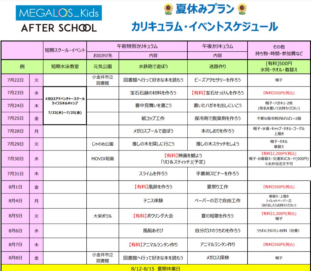 小学1年生は「メガロス武蔵小金井」で行われている学童保育(キッズアフタスクール)に参加していました。現在は「夏休みお預かりプラン」が実施されています。