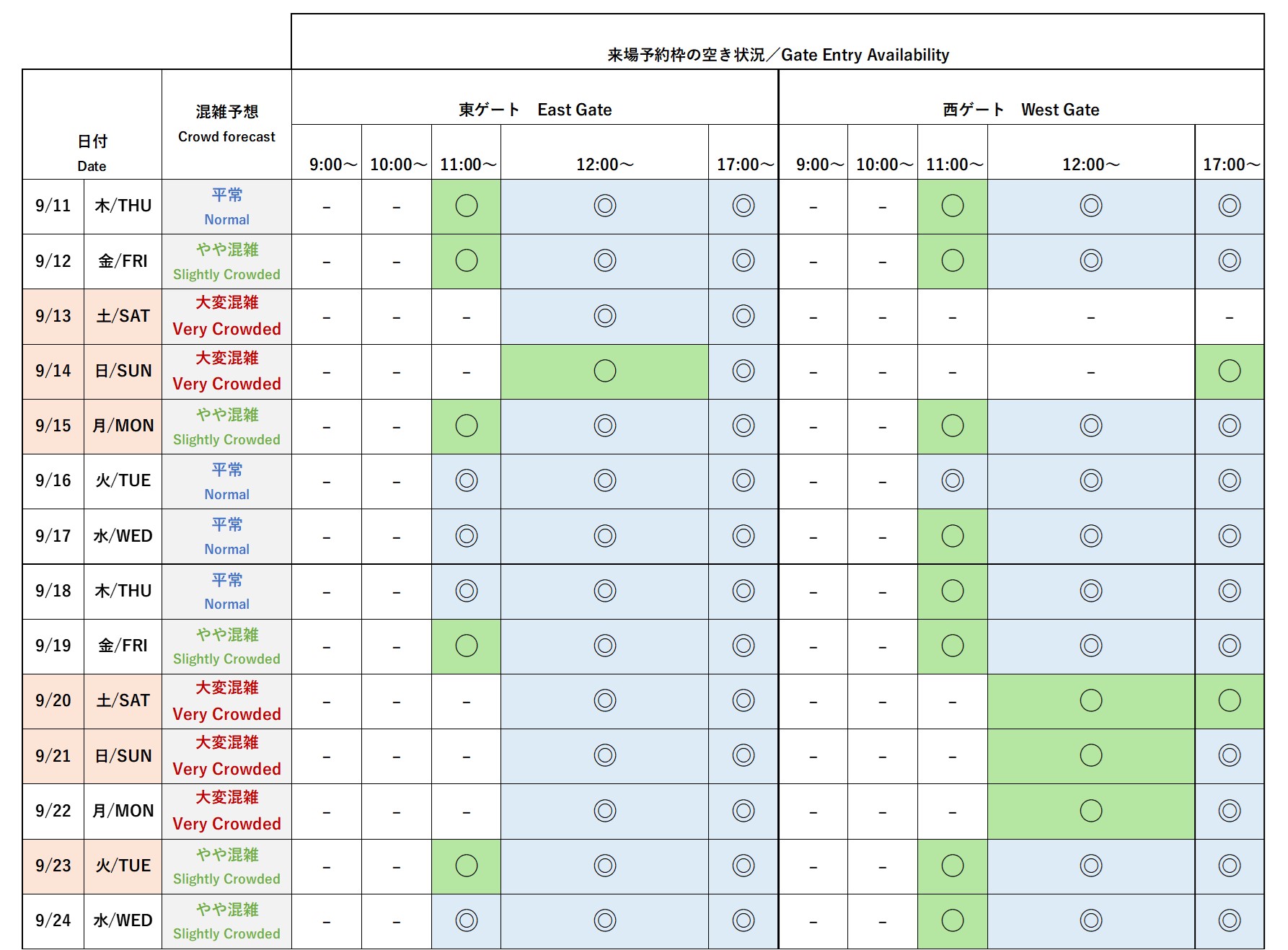早くも閉幕日までの9時・10時入場枠はほぼ全ての日で「満員」となっています。東ゲートも西ゲートもです。