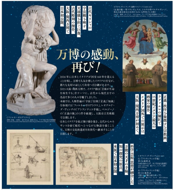 日本とイタリアの国交160周年を記念し、万博の文化的レガシーを継承する趣旨で企画された。天球を肩に担う巨神を表した彫像「ファルネーゼのアトラス」(2世紀)と、ルネサンス期の画家ペルジーノの代表作「正義の旗」(1496年)を展示。レオナルド・ダ・ヴィンチの「アトランティコ手稿」は同館で展示中のものとは別の2点(1478年ごろ、1480~82年ごろ)を本展のために新たに取り寄せ、日本では初公開となる。