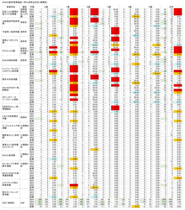 申込数は前年より20人増の1139人、募集数は33人減の993人でした。全年齢を通じての入所倍率は1.09倍から1.15倍へと上昇しました。大阪市全体の平均値1.01倍を上回っており、やや入所しにくい区となっています。