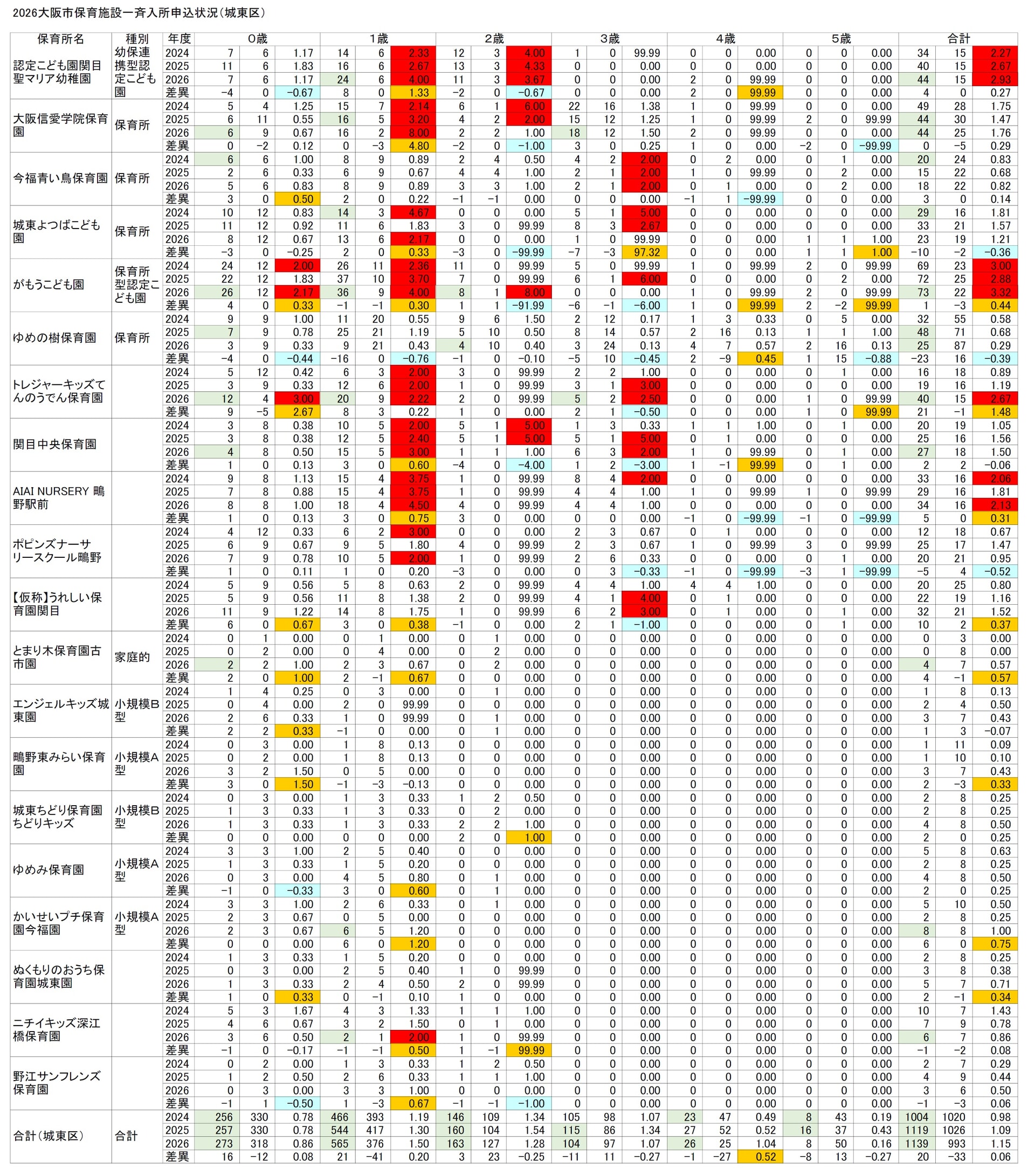 特に厳しいのは、入所倍率が著しく高く、一部に保育士等優先申込もある、森之宮保育園・関目聖マリア幼稚園・大阪信愛学院保育園・がもうこども園・AIAI NURSERY 鴫野駅前です。フルタイム共働き+きょうだい加点でも楽観できないぐらいです。