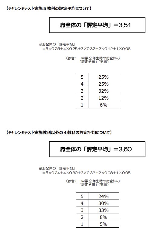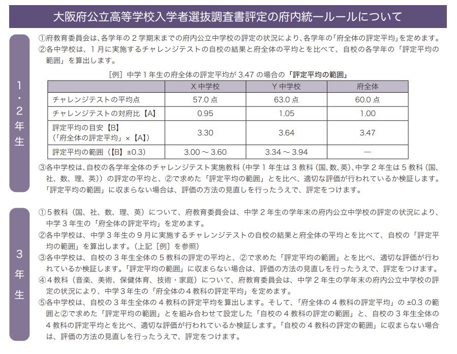 大阪府では公立高校入試に於いて内申点(評定の合計)を利用します。各学校毎で内申点の付け方に差があると、高校入試の公平さが揺らぎます。